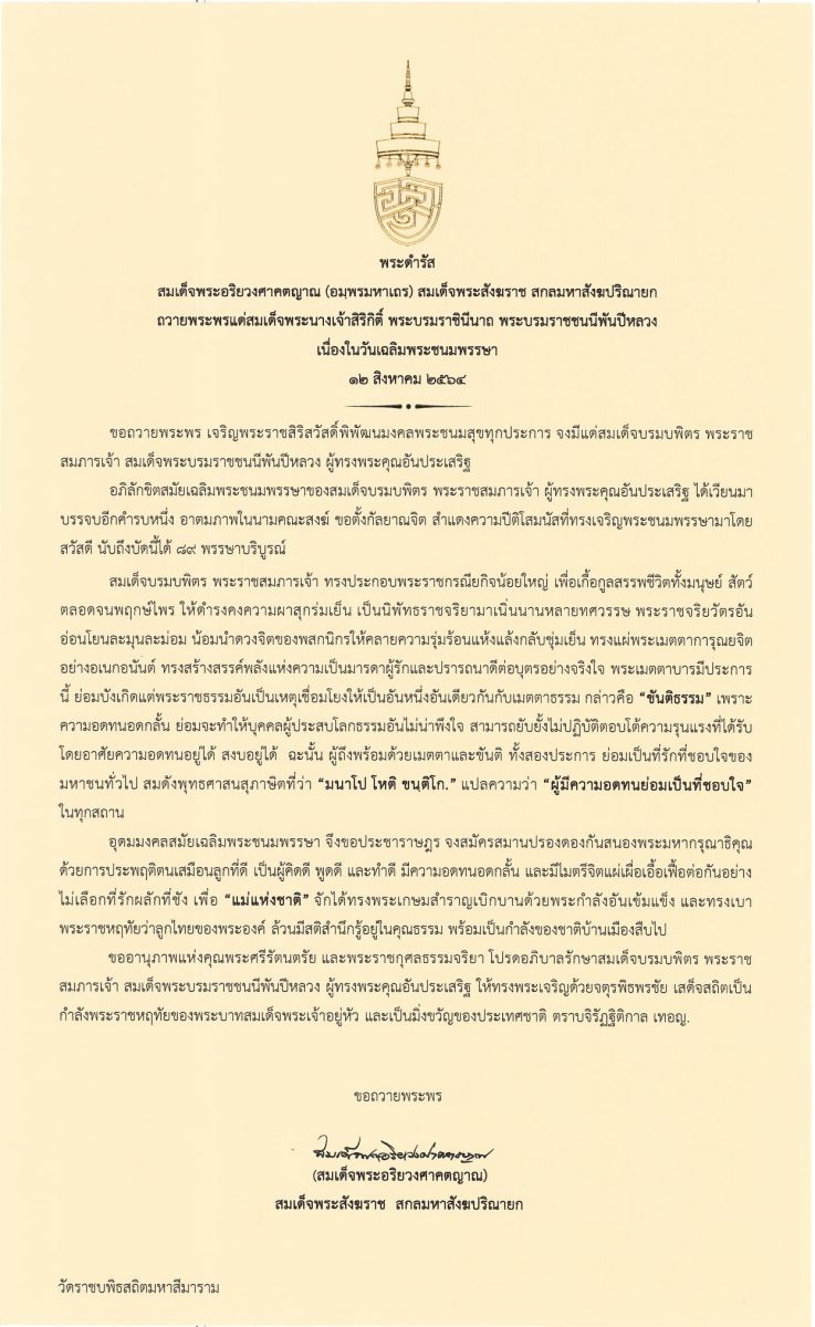 "สมเด็จพระสังฆราช" มีพระดำรัสถวายพระพร "สมเด็จพระบรมราชชนนีพันปีหลวง"