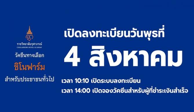 เปิดจอง "ซิโนฟาร์ม" บุคคลธรรมดา รอบสอง 4 ส.ค. นี้