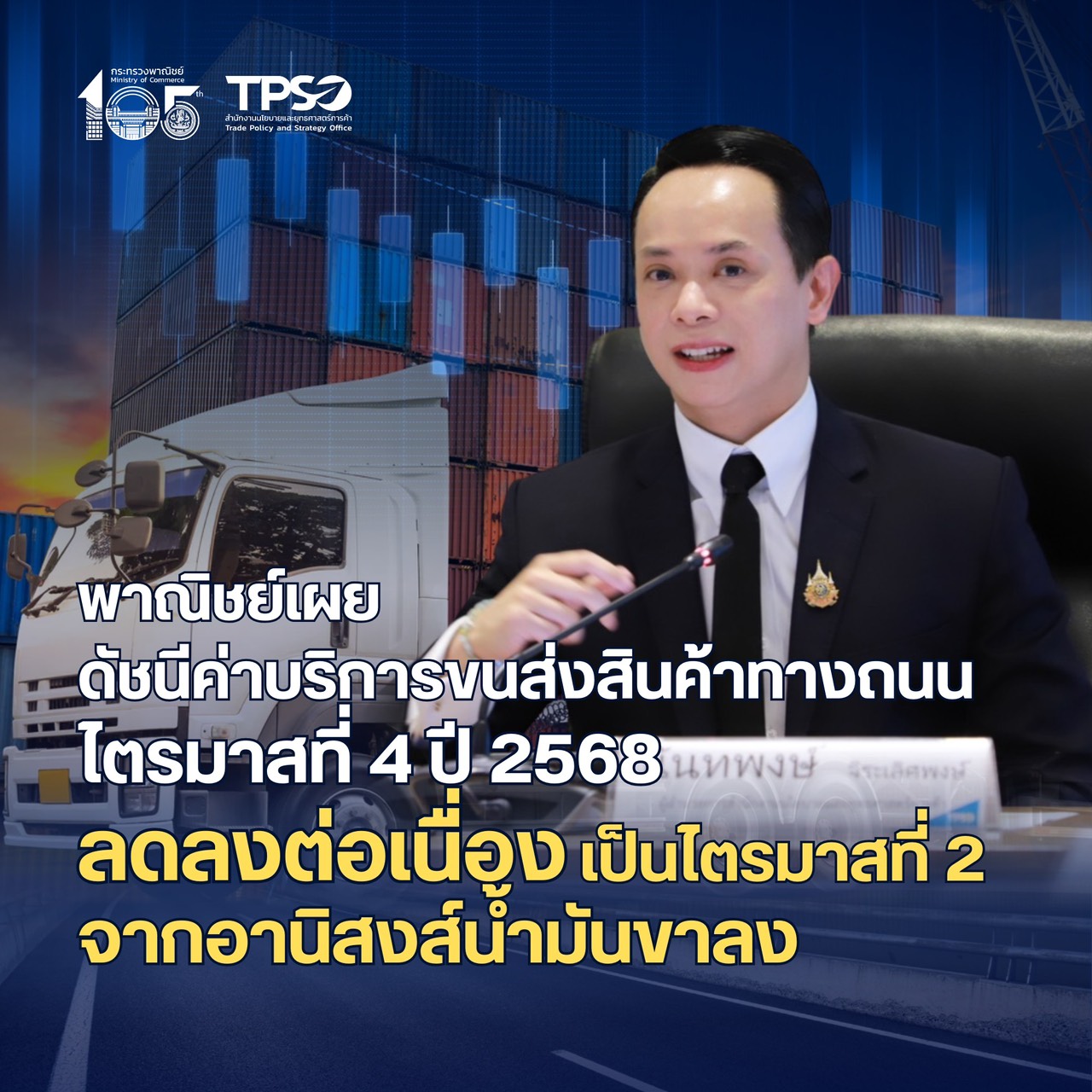 พาณิชย์เผยดัชนีค่าบริการขนส่งสินค้าทางถนนไตรมาสที่ 4 ปี 2568 ลดลงต่อเนื่องเป็นไตรมาสที่ 2...