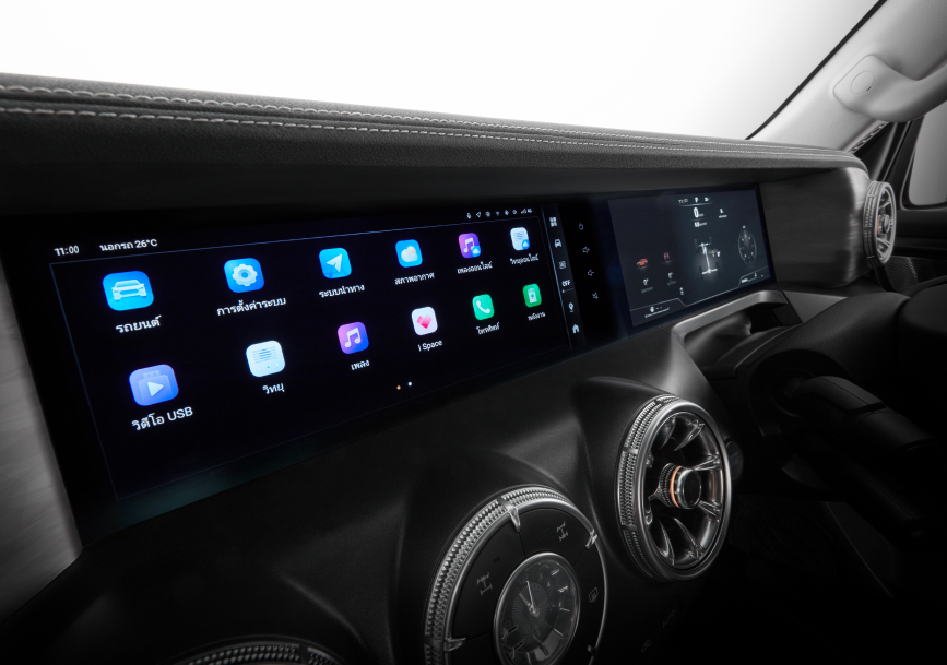 จอสัมผัส 12.3″ บนคอนโซล + หน้าปัด TFT 12.3″, HUD, Ambient Light (64 สี), นาฬิกาคลาสสิก
