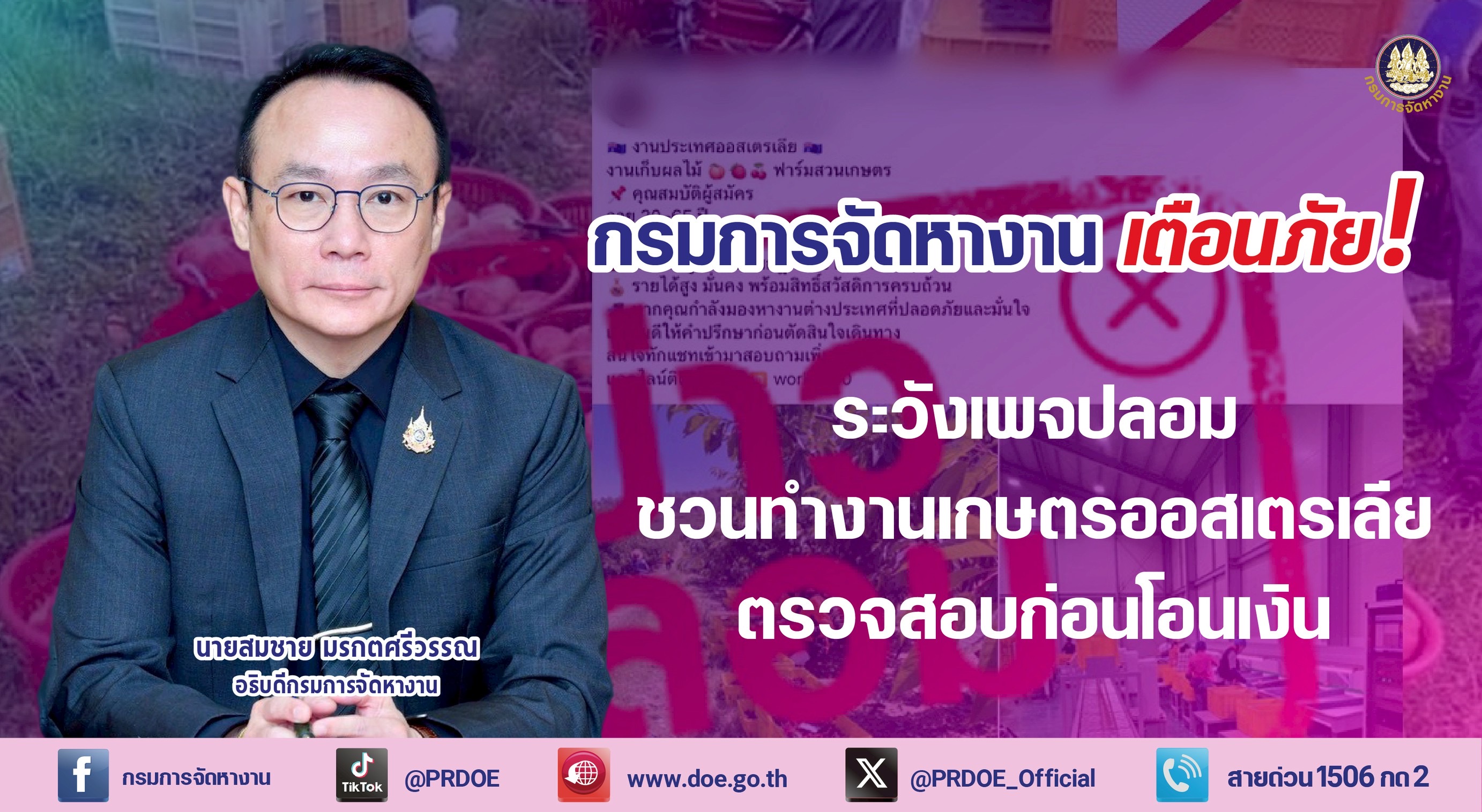 กรมการจัดหางาน เตือนภัยระวังเพจปลอมระบาดหนัก ชวนทำงานเกษตรออสเตรเลีย...
