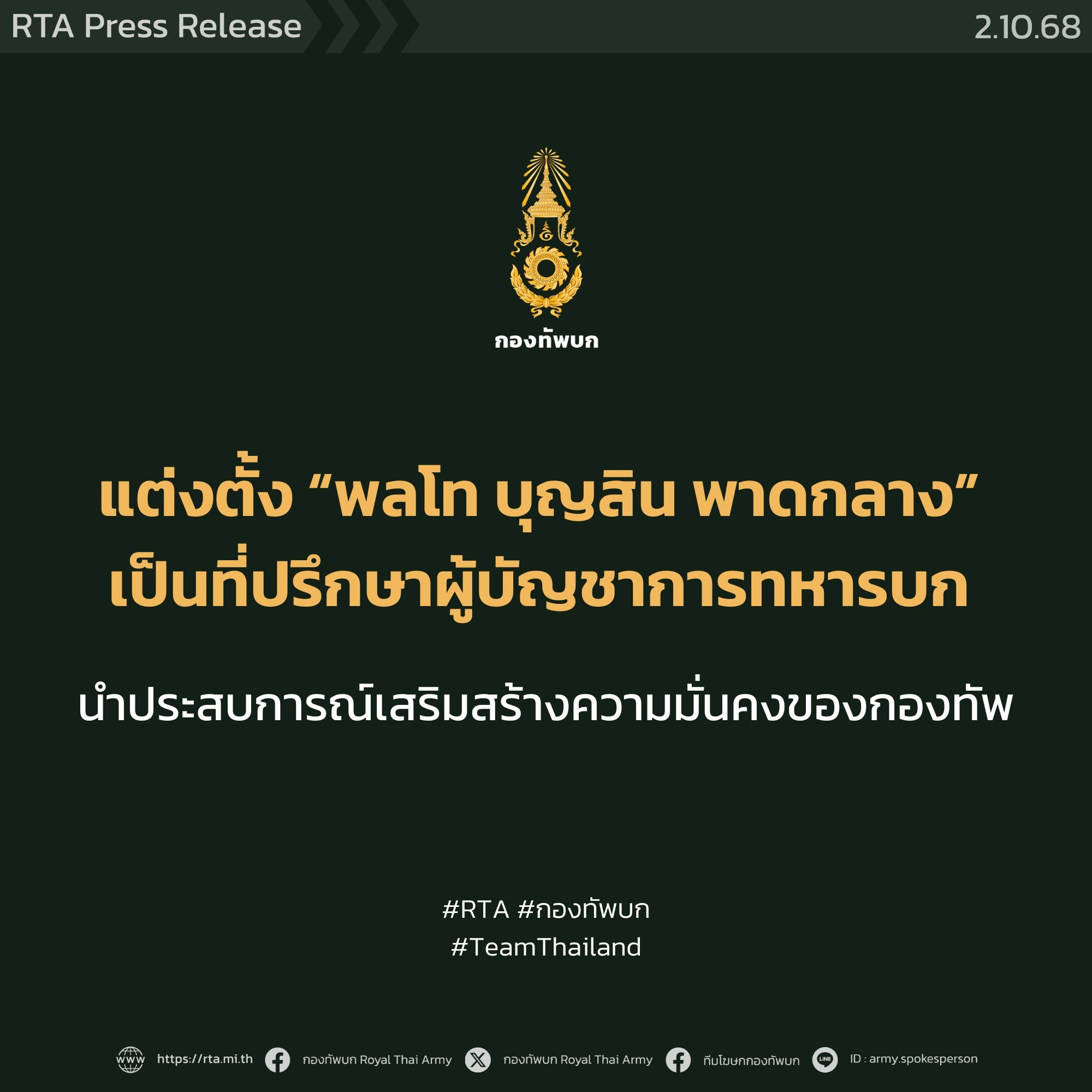 กองทัพบกแต่งตั้ง “พลโท บุญสิน พาดกลาง” เป็นที่ปรึกษาผู้บัญชาการทหารบก...