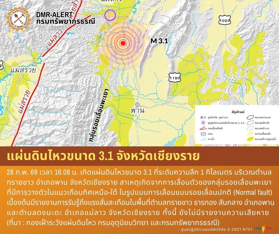 แผ่นดินไหวขนาด 3.1 บริเวณจังหวัดเชียงราย
