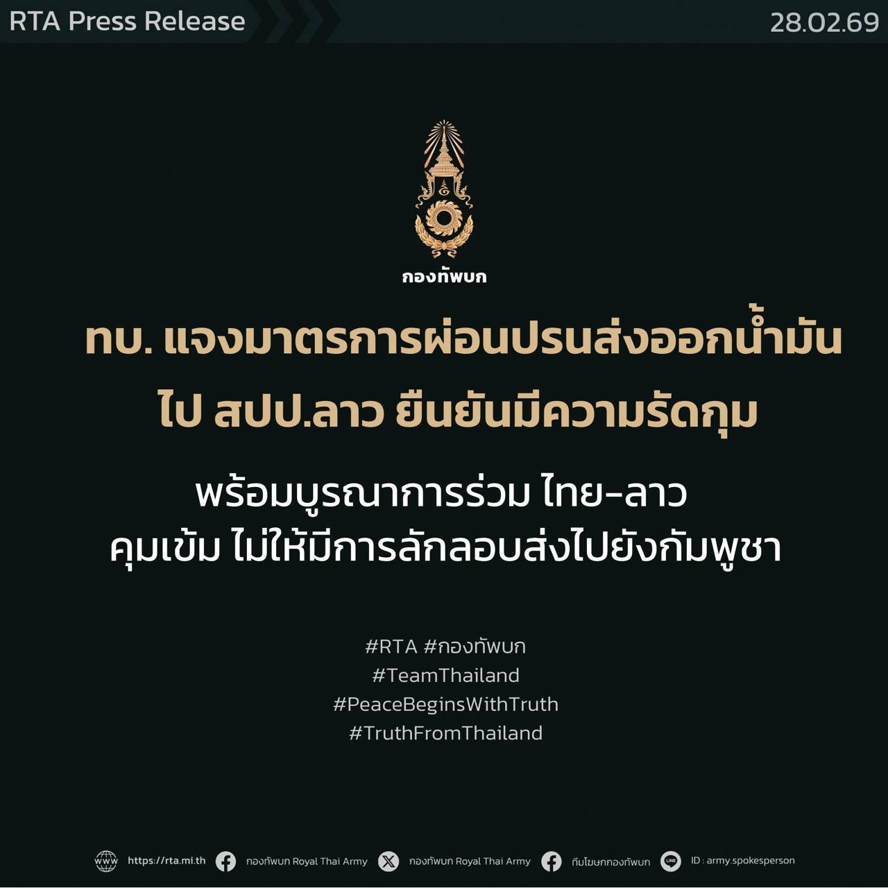 ทบ. แจงมาตรการผ่อนปรนส่งออกน้ำมันไป สปป.ลาว ยืนยันมีความรัดกุม...