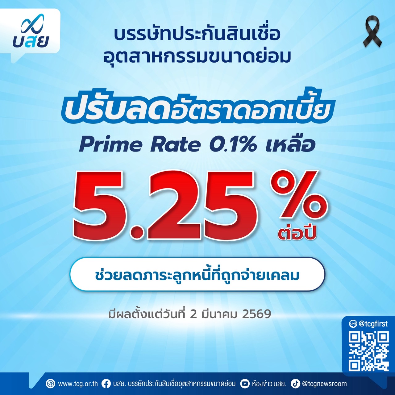 บสย. ลดดอกเบี้ย Prime Rate เหลือ 5.25% ต่อปี มีผล 2 มี.ค. นี้...