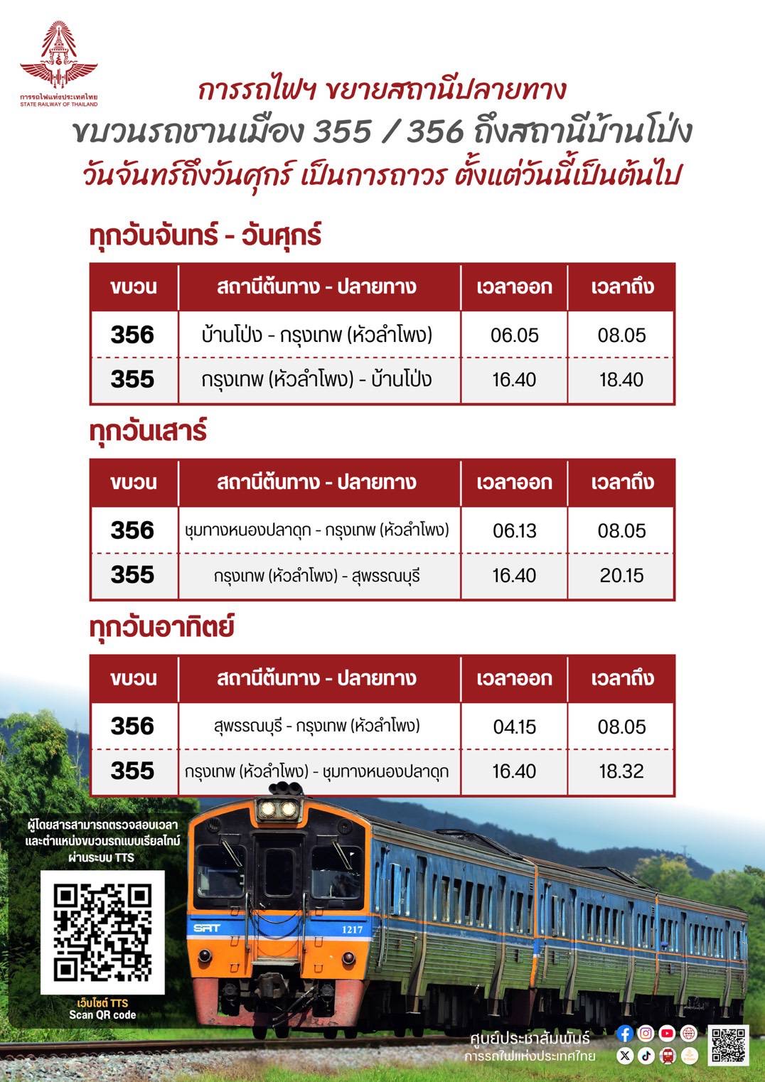 การรถไฟฯ ขยายปลายทางขบวนรถชานเมือง 355/356 ถึงสถานีบ้านโป่ง...