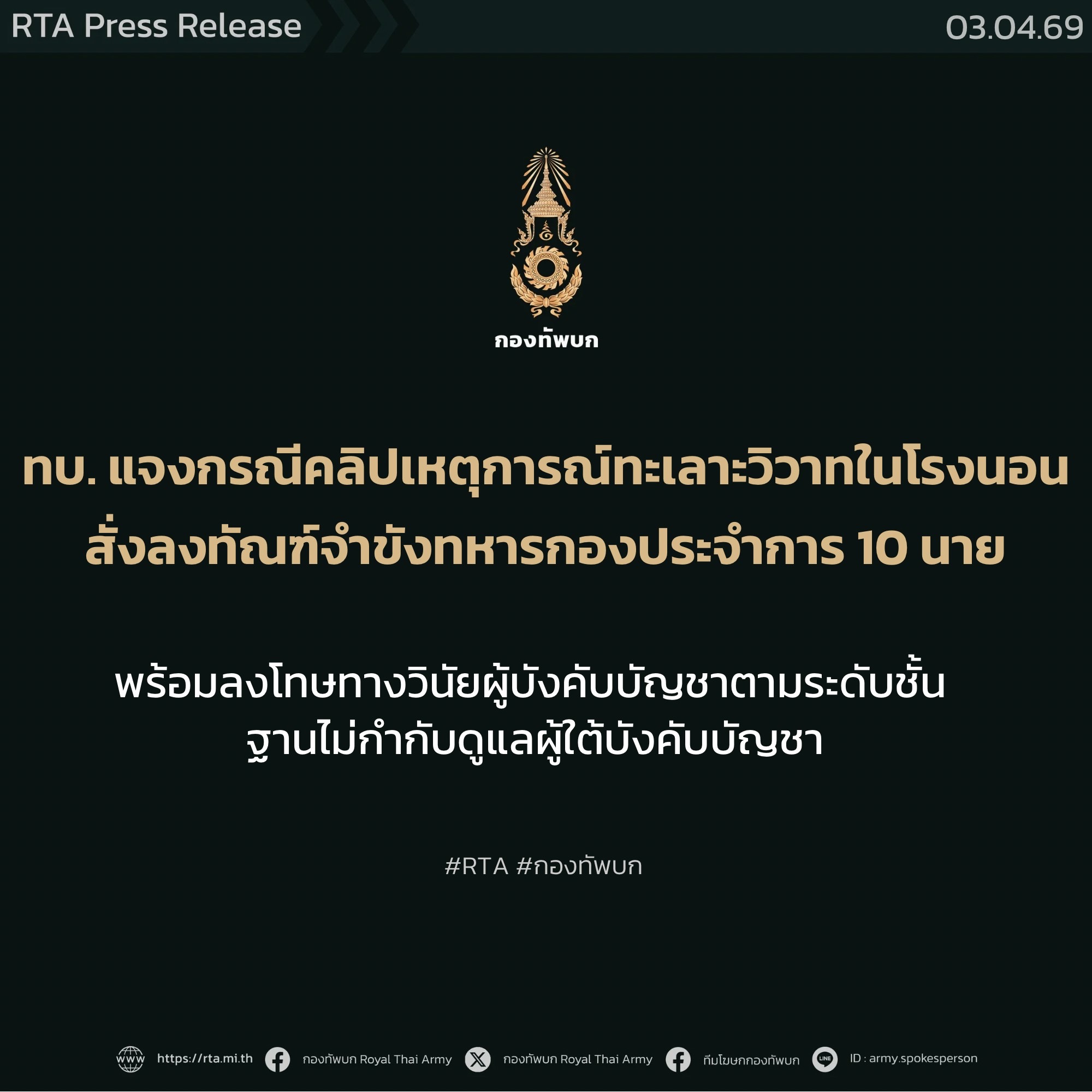 ทบ. ชี้แจงกรณีคลิปเหตุการณ์ทะเลาะวิวาทในโรงนอน...